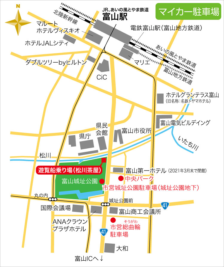 (1)「南富山駅前」行きの場合…「桜橋」で降り、松川に沿って西の方に歩いてください(徒歩で約5分)。
