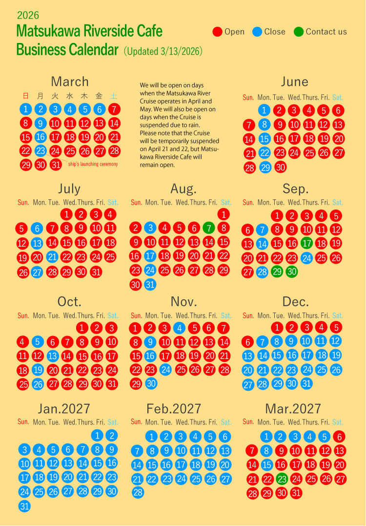 4/26/2026 – 8/30/2026 (Matsukawa History Cruise)