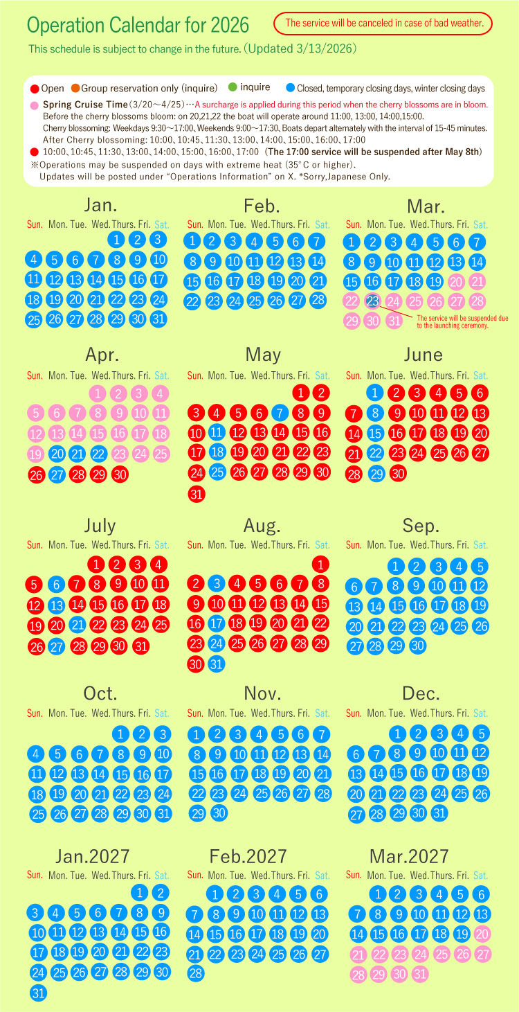 *Operation is suspended in case of bad weather. (if inclement weather is forecast, the cruise will be cancelled earlier).
